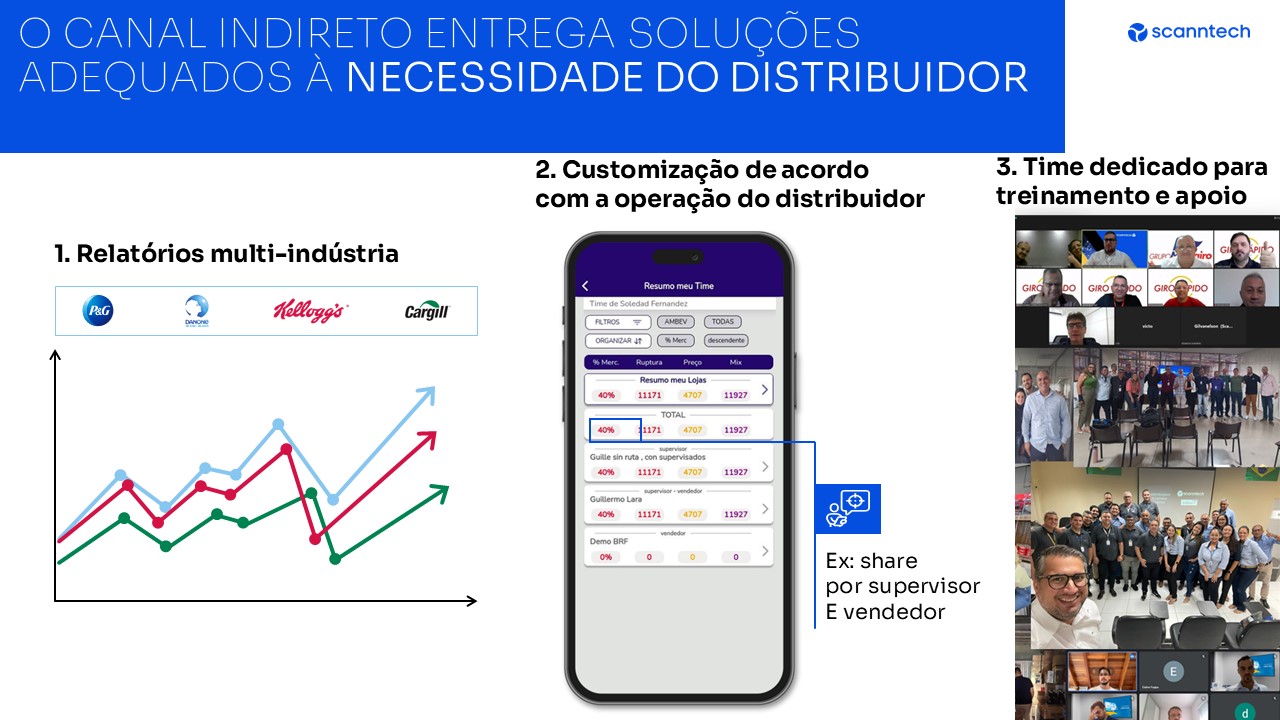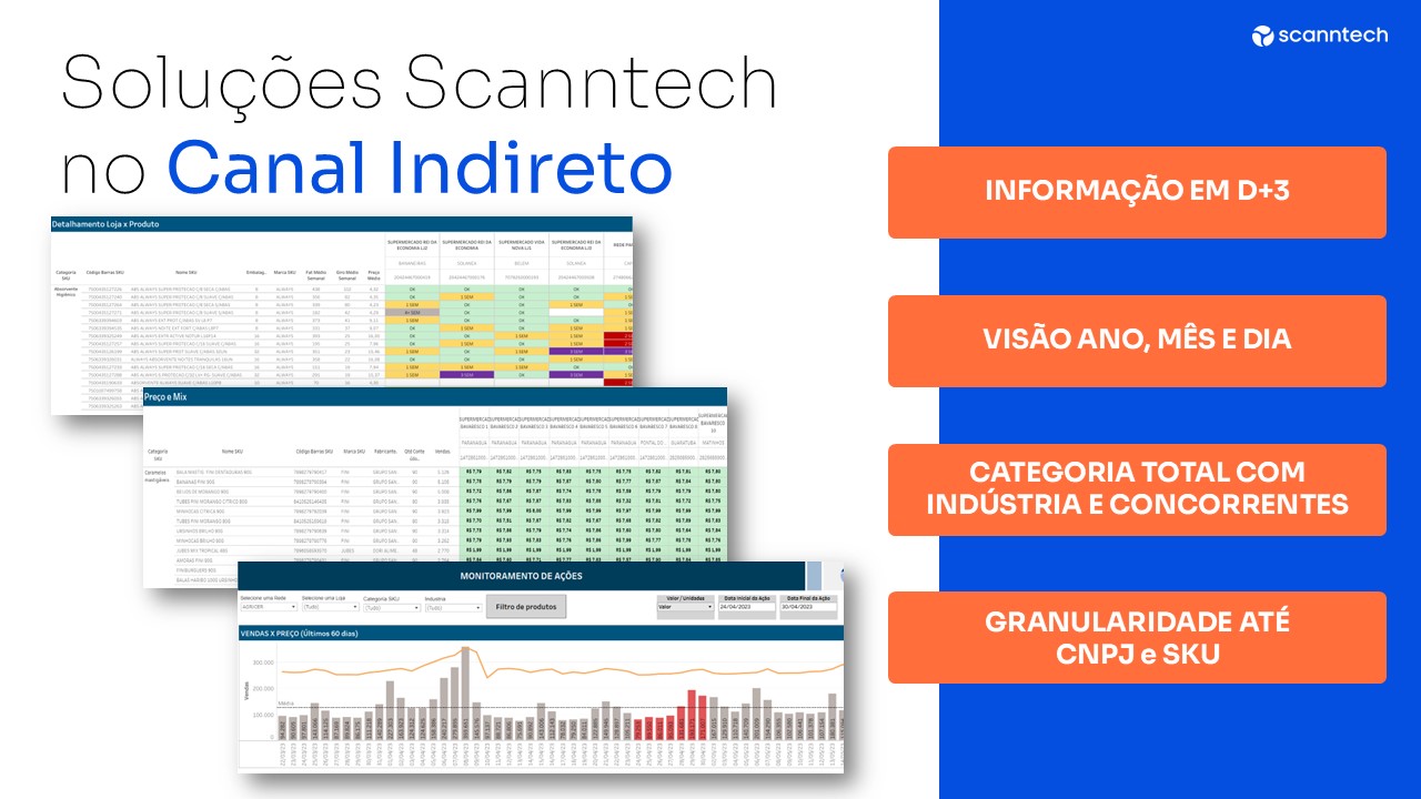 Oferecemos diversas soluções para o canal indireto, com relatórios multi-indústrias que centralizam todas as informações necessárias para a operação do distribuidor. Nossos relatórios fornecem dados atualizados (D+3), visão anual, mensal e diária, com granularidade até CNPJ e SKU. As categorias incluem informações detalhadas sobre indústrias e concorrentes, organizadas por pastas e equipes de vendas.