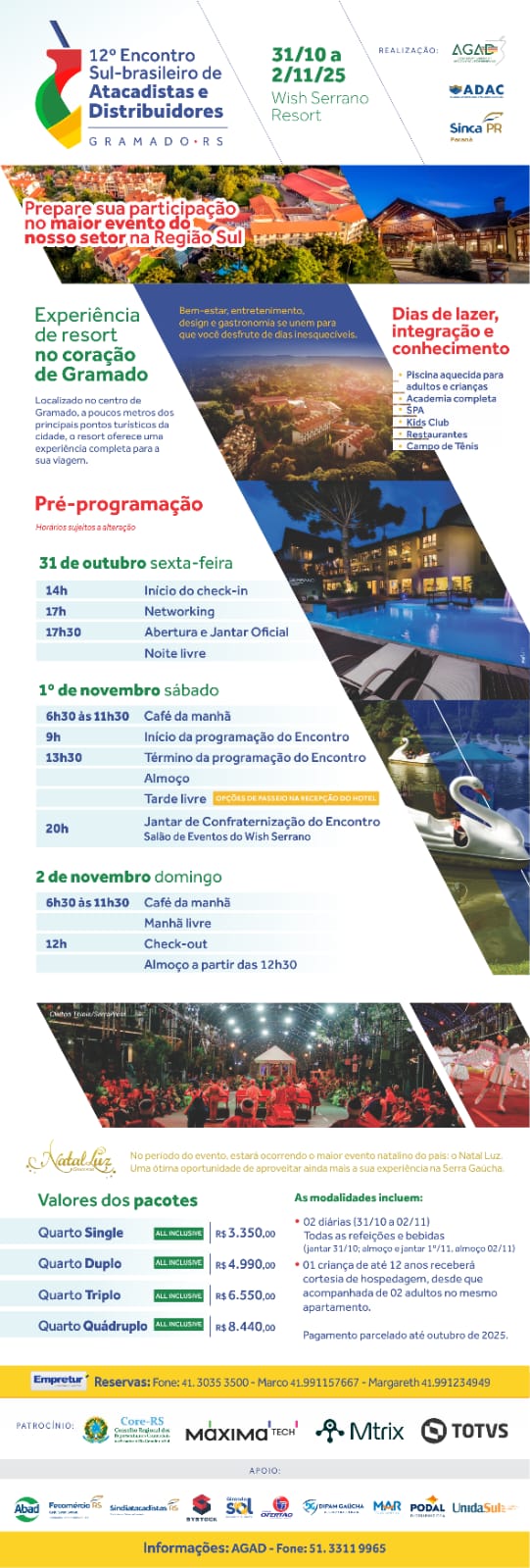 Entre os dias 31 de outubro e 2 de novembro de 2025, o setor atacadista e distribuidor tem um encontro marcado em um dos destinos mais encantadores do Brasil: Gramado (RS). O 12º Encontro Sul-Brasileiro de Atacadistas e Distribuidores, que acontecerá no elegante Wish Serrano Resort, promete unir conteúdo de qualidade, networking estratégico e momentos inesquecíveis de integração empresarial e familiar.