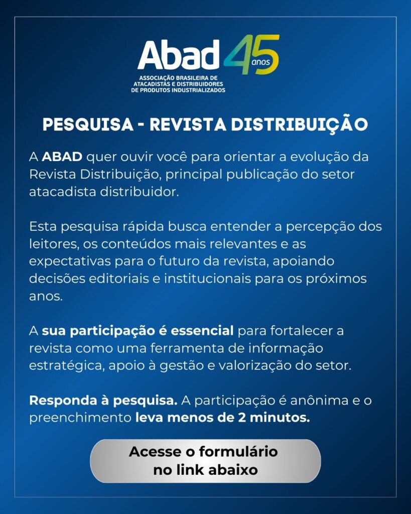 A Associação Brasileira de Atacadistas e Distribuidores de Produtos Industrializados (Abad) está promovendo uma pesquisa rápida com o objetivo de ouvir os leitores e orientar a evolução da Revista Distribuição, principal publicação do setor atacadista distribuidor no Brasil. A iniciativa busca compreender a percepção do público, identificar os conteúdos mais relevantes e mapear as expectativas […]